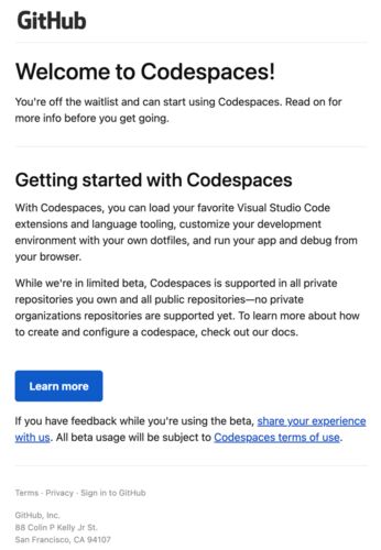 GitHub Codespacesを使ってみようと思ったら、まだベータ版らしく順番待ちが必要だったので登録だけ済ませて待っていたら先日招待メールが届いたので早速触ってみました。 招待メール GitHub Codespacesとは クラウドでホストされている開発環境です。Config…