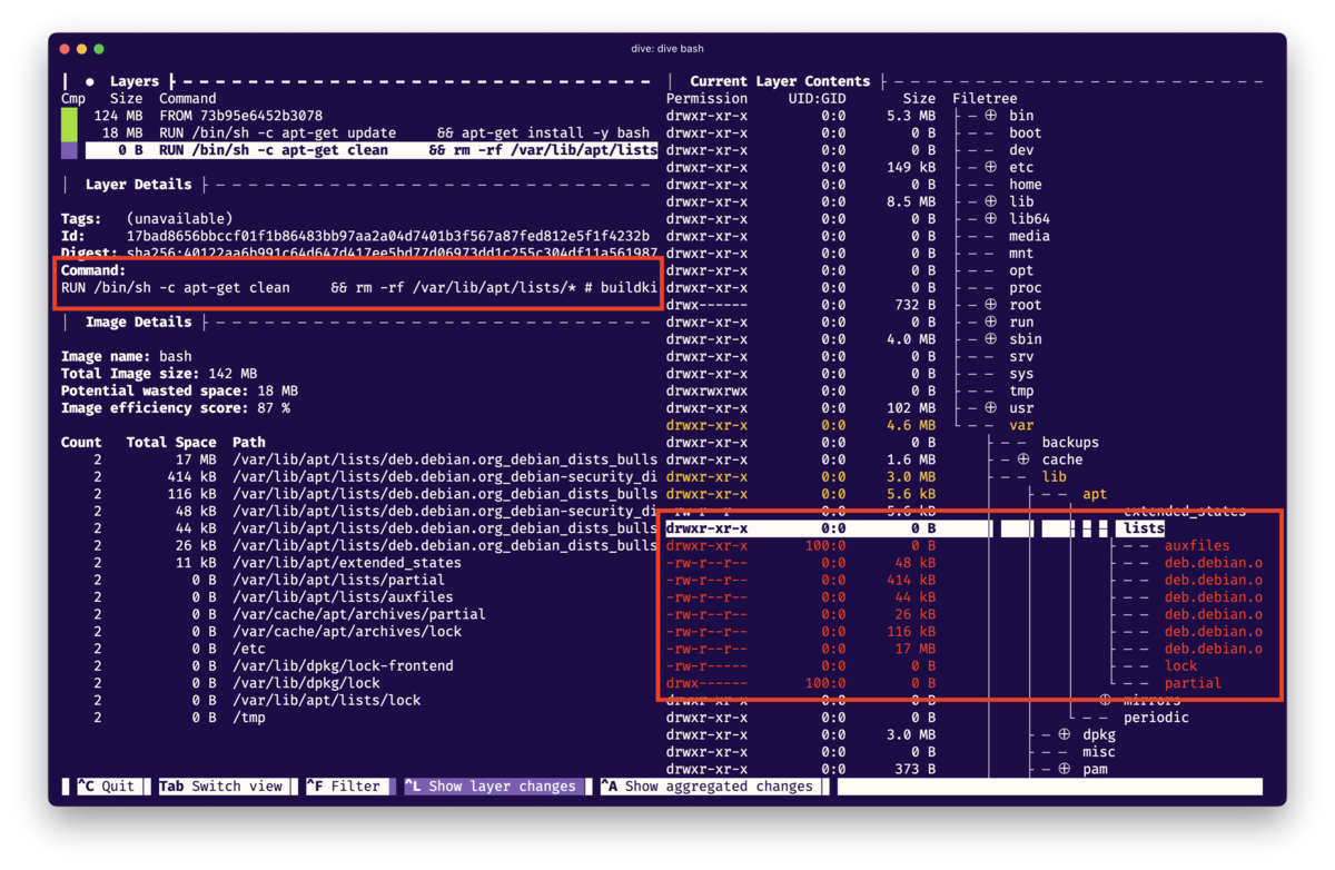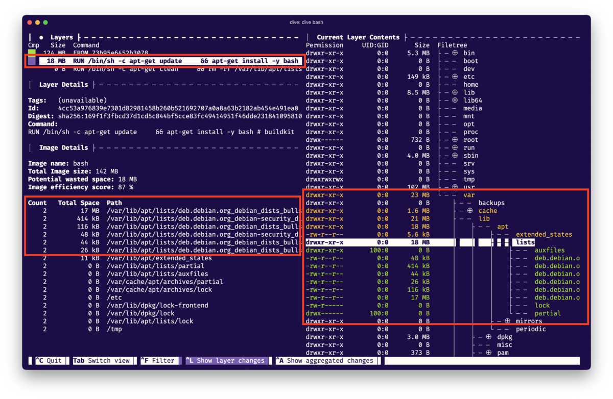 diveはDockerイメージのレイヤーに含まれるファイルを可視化できるツールです。ファイルを可視化できると何がいいのかというと、それぞれのレイヤーになるゴミファイルを発見できます。例えば、あるレイヤーで生まれたファイルを別のレイヤーで削除しても、すべてのレイヤーが積み重なって1つのイメージなので、イメージサイズは変わりません。これを解消できます。