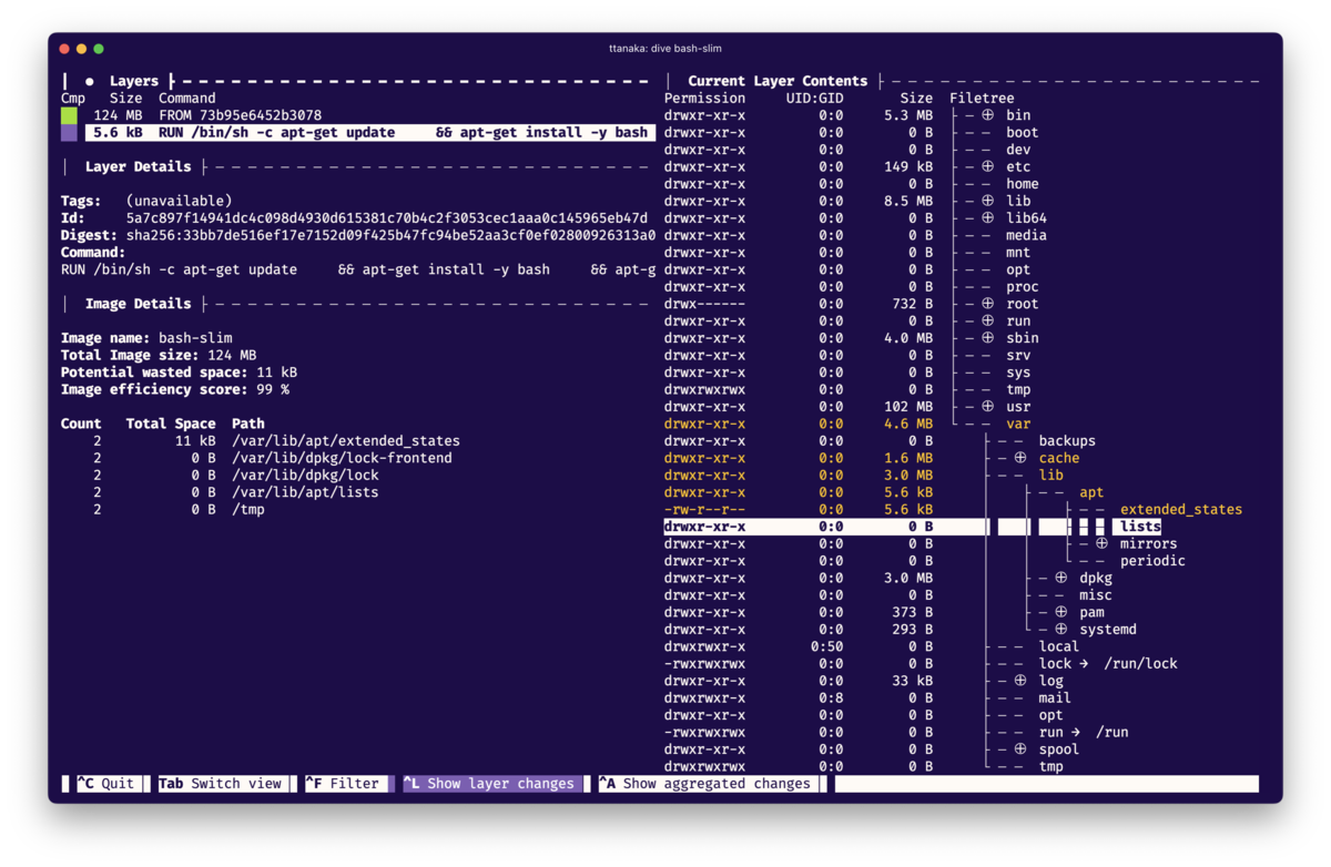 私の環境はMacなのでbrew install diveしました。Dockerイメージも公開されてるので、マシンにインストールしたくない方はこちらを使ってもよさそうです。今回はインストールした前提で話を進めます。
