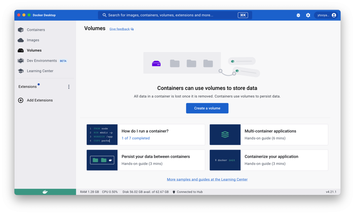 Docker for macのアカウントのログイン情報などは削除されないようで、起動したら元の状態に戻っていました(右上の表示から、Dockerログイン済みであることがわかる)。
