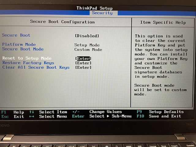 BIOSからセキュアブートをDisabled、Platform ModeをSetup Modeにします。