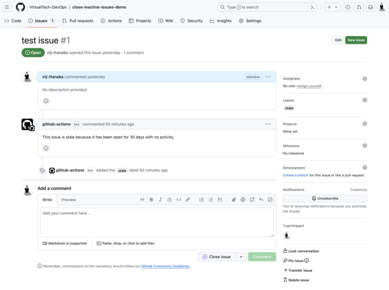 変更点は、手動でも実行できるようにworkflow_dispatchを追加したのと、古いと判断されるまでの期間days-before-issue-stale:を1日、古いと判断されてからクローズされるまでの期間days-before-issue-close:を1日にセットしてあります。