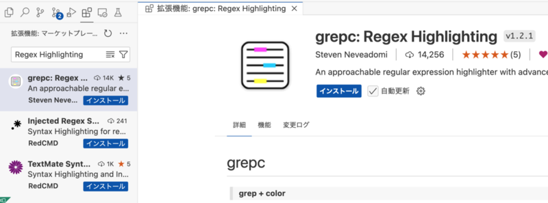 アクティビティサイドバーから拡張機能を開き、Regex Highlightingを検索してインストールしてください。