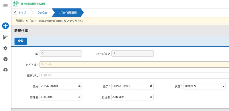 新規作成画面でデフォルトで1週間後が設定されている完了日を当日に変更することをやってみましょう。(当日を設定するだけであれば、他にもっといいやり方があるかもしれませんが)